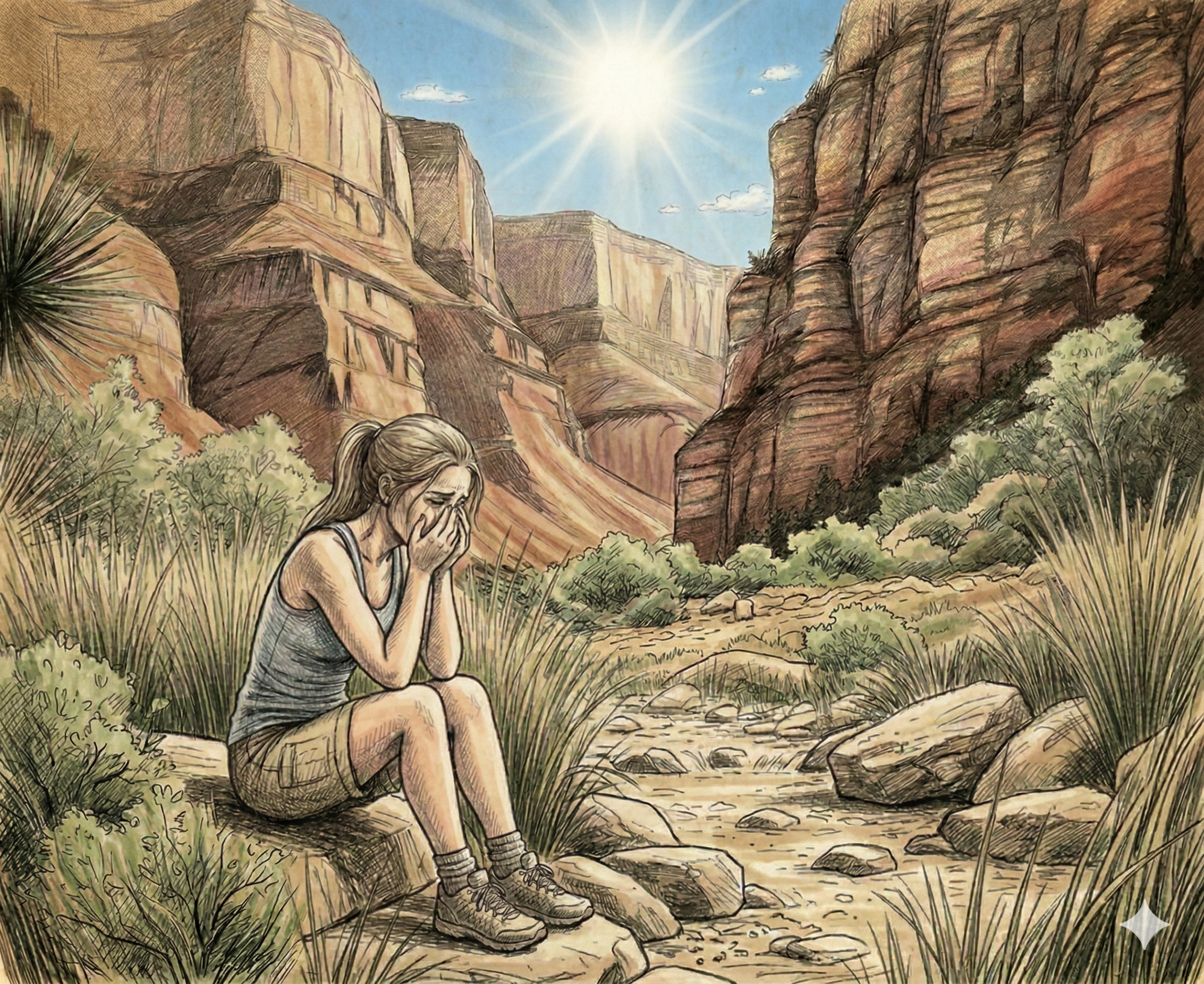 What they hadn't accounted for was the water. The canyon heat burns through your supply faster than you'd expect, and they ran out hours into the hike. By the time they reached the fork near Ribbon Falls, she was spent. She couldn't go any further.