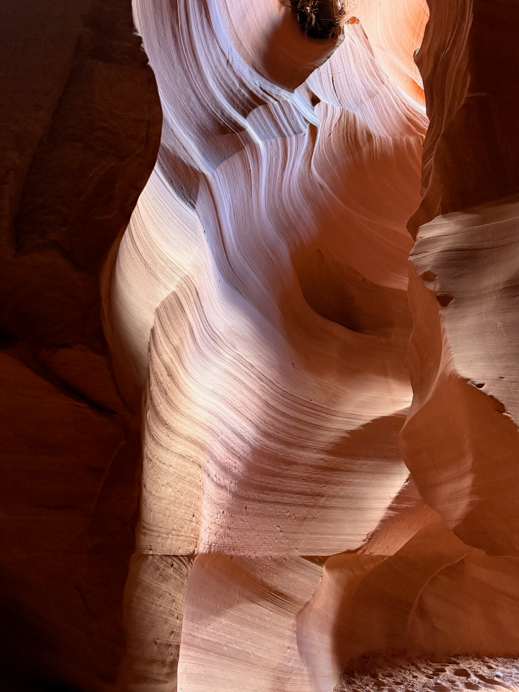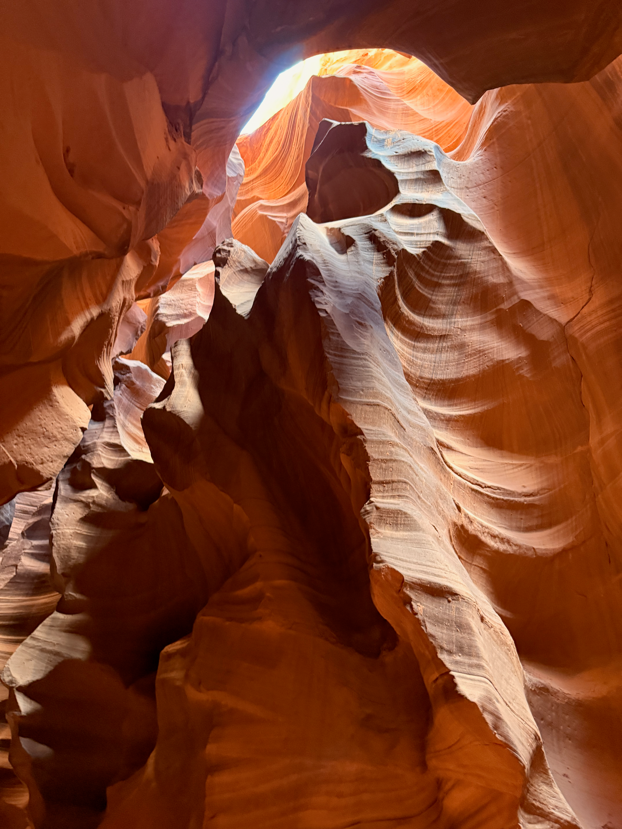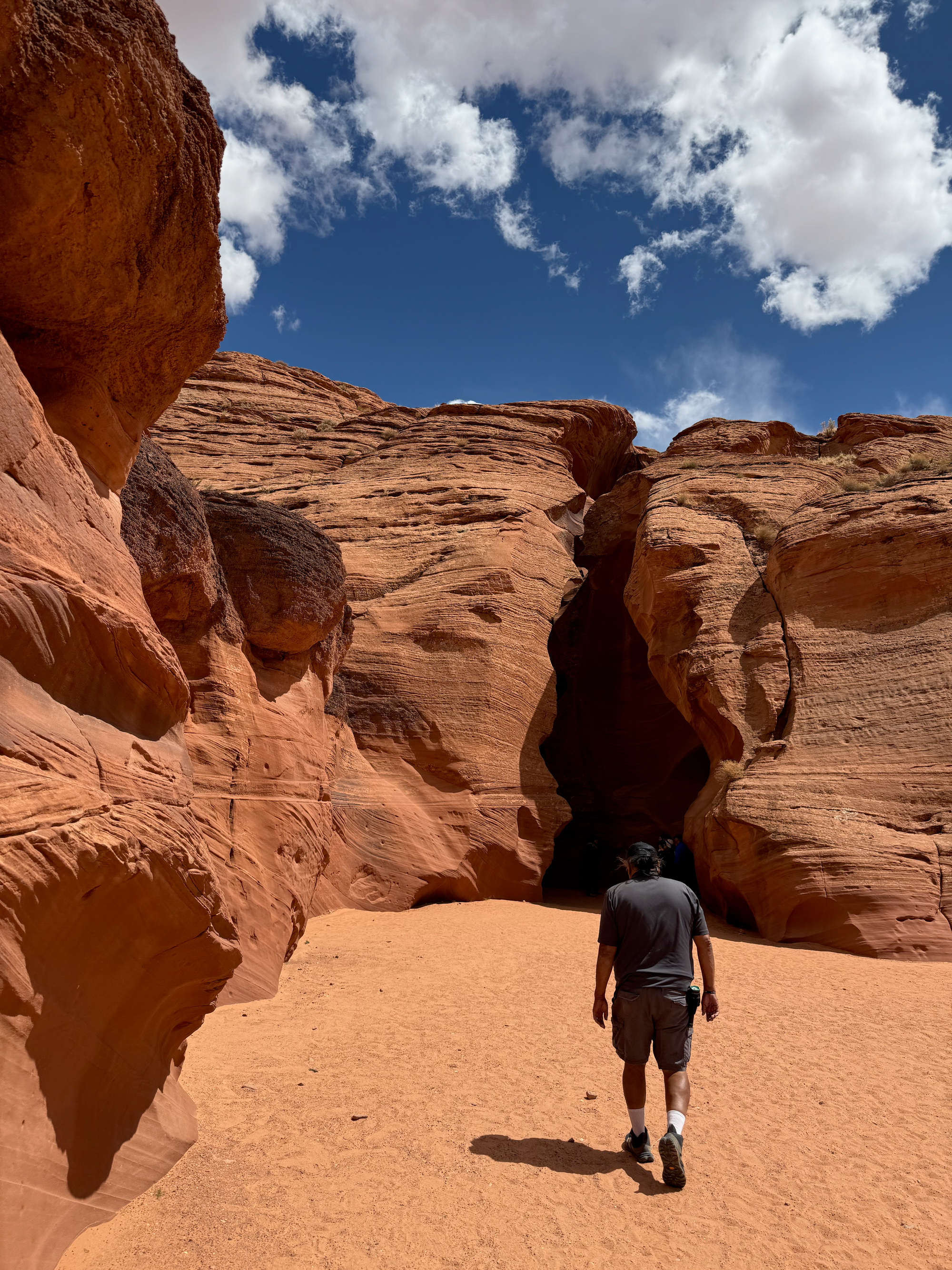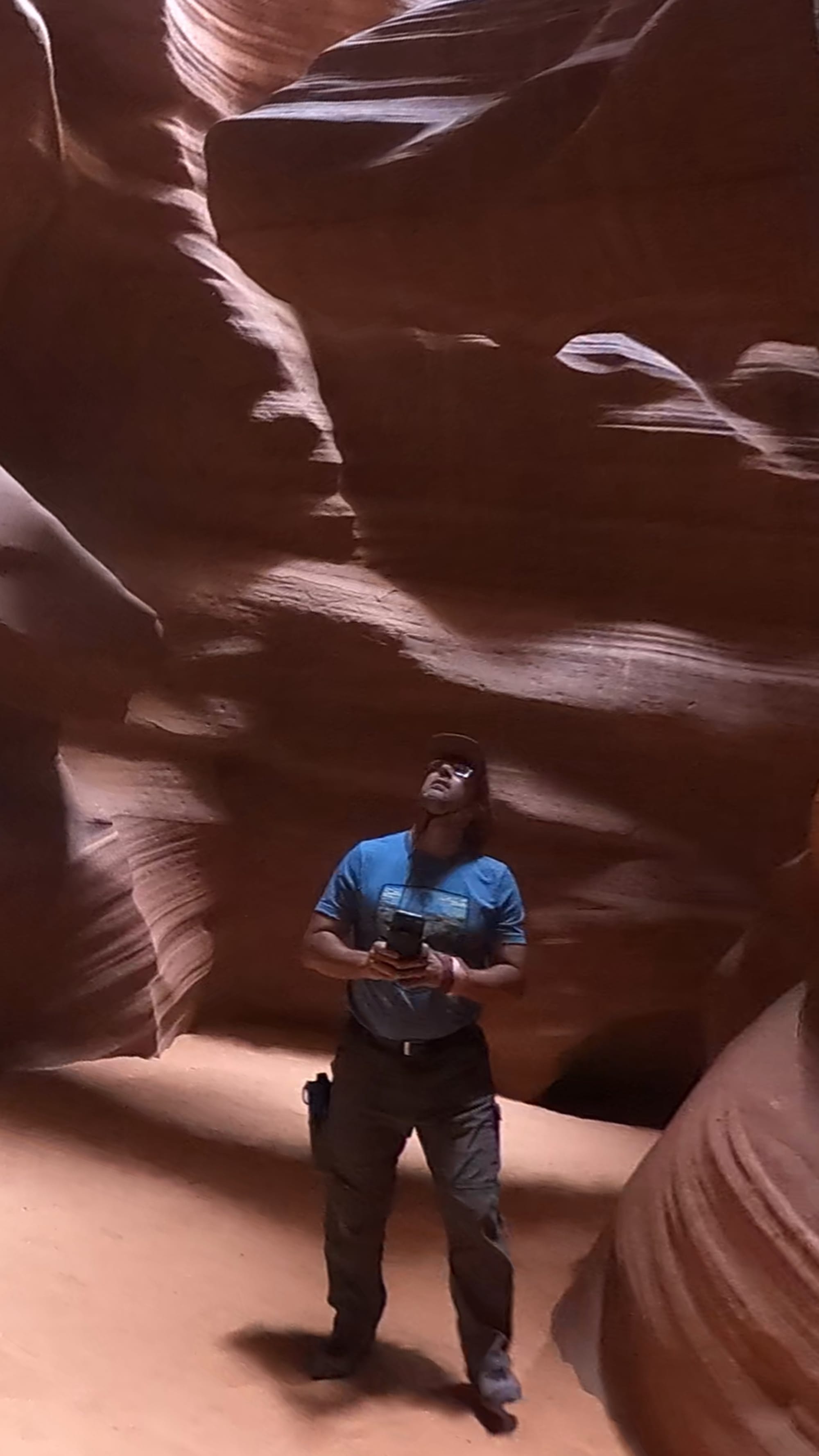 Antelope Canyon is a slot canyon carved into Navajo sandstone by centuries of flash floods, and it sits on land managed by the Navajo Nation just outside Page, Arizona. You can't walk in on your own — every visit is guided, which turns out to be exactly the right call. Our guide from Navajo Tours knew where the light was hitting, which angles worked, and how to position a camera inside a narrow crack in the earth to make the result look like a Renaissance painting. We mostly tried to keep up.