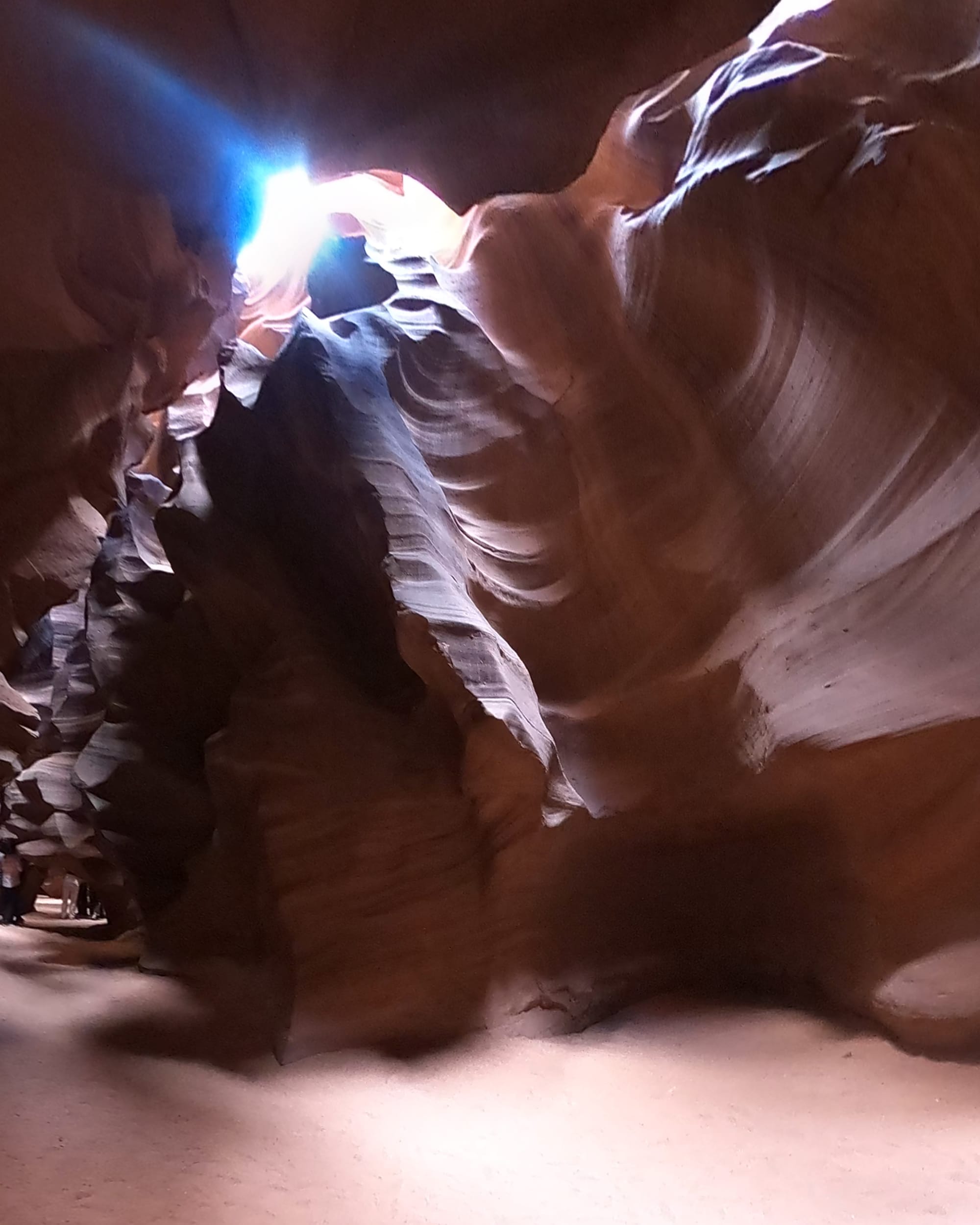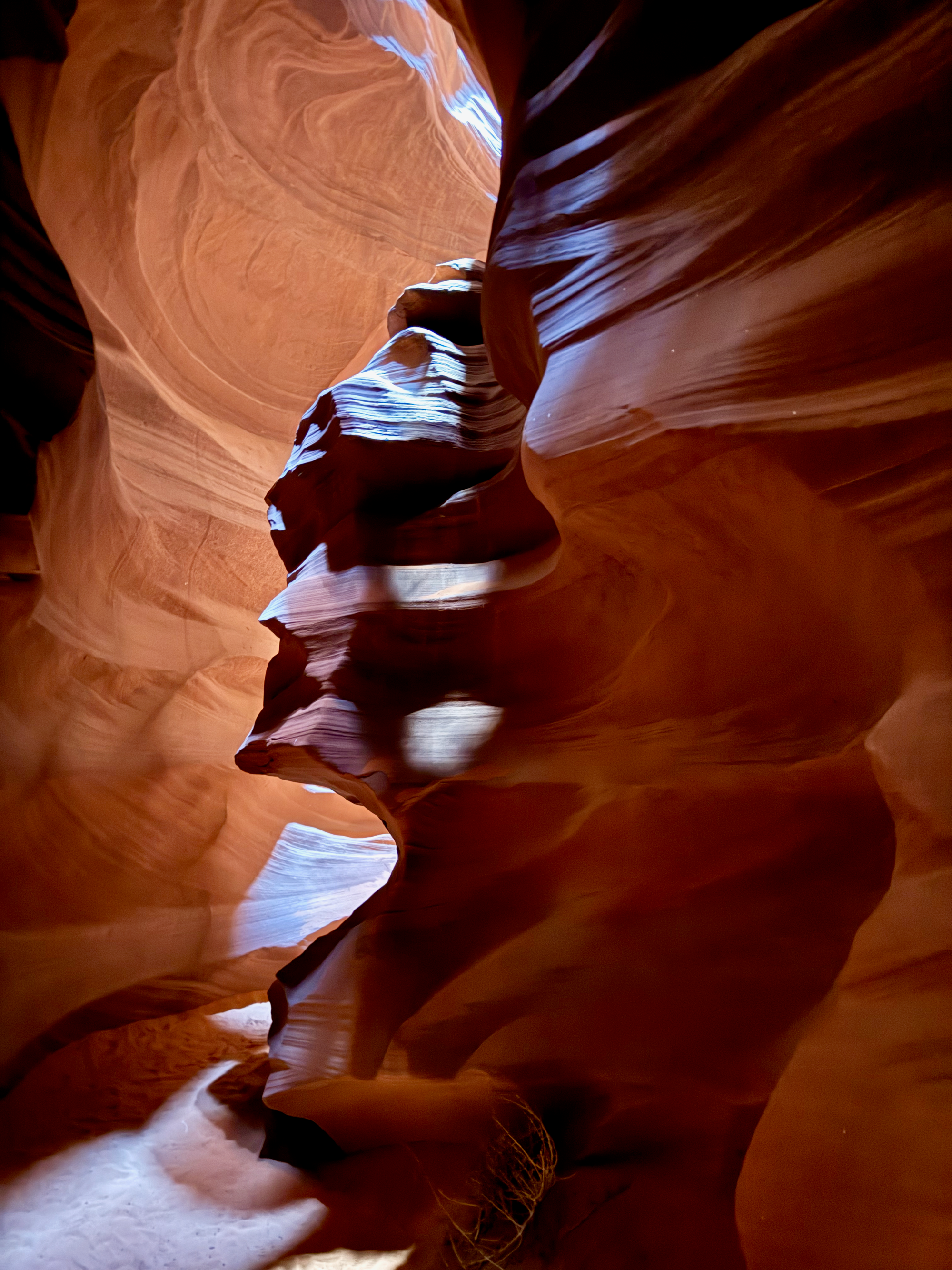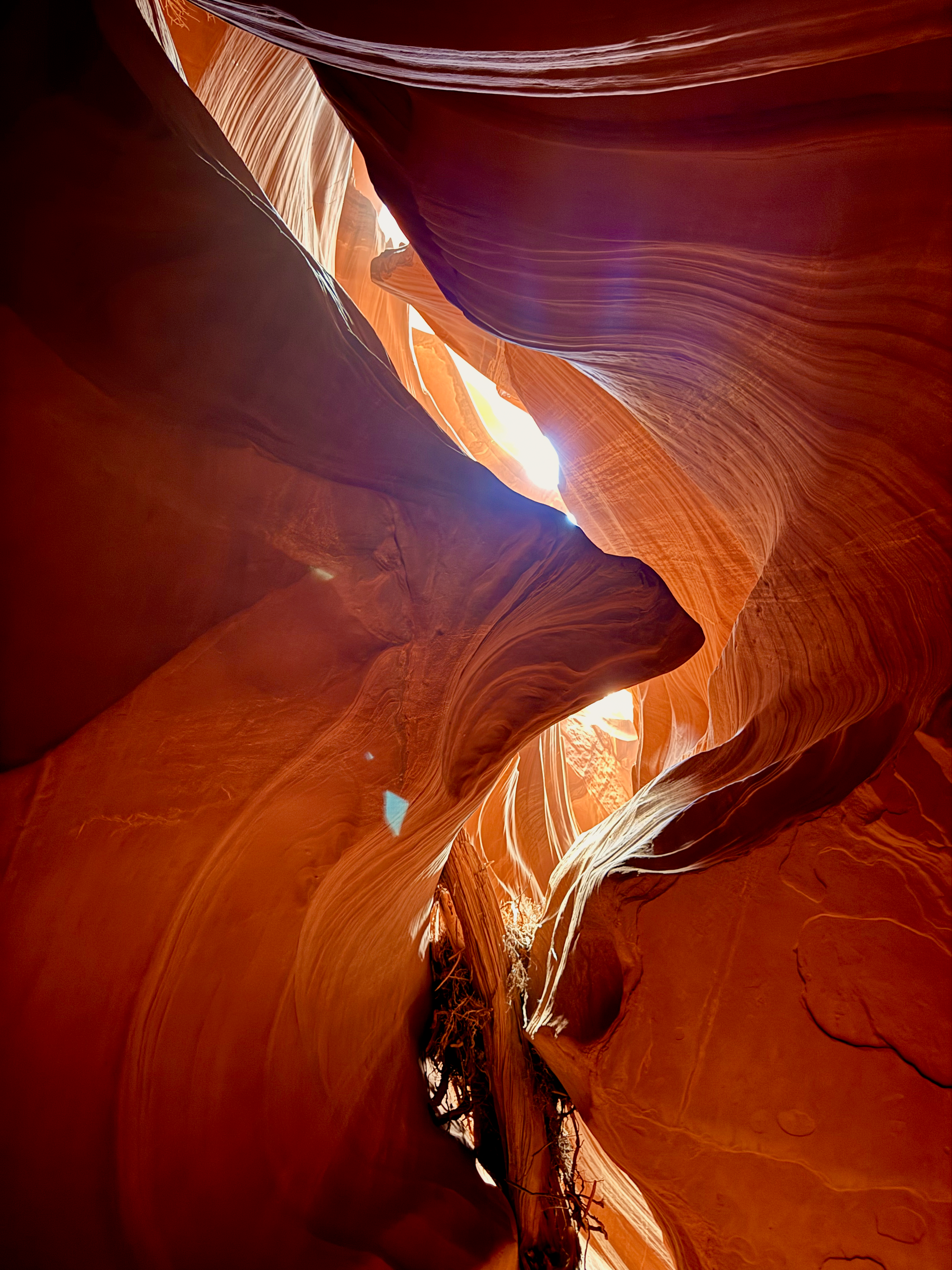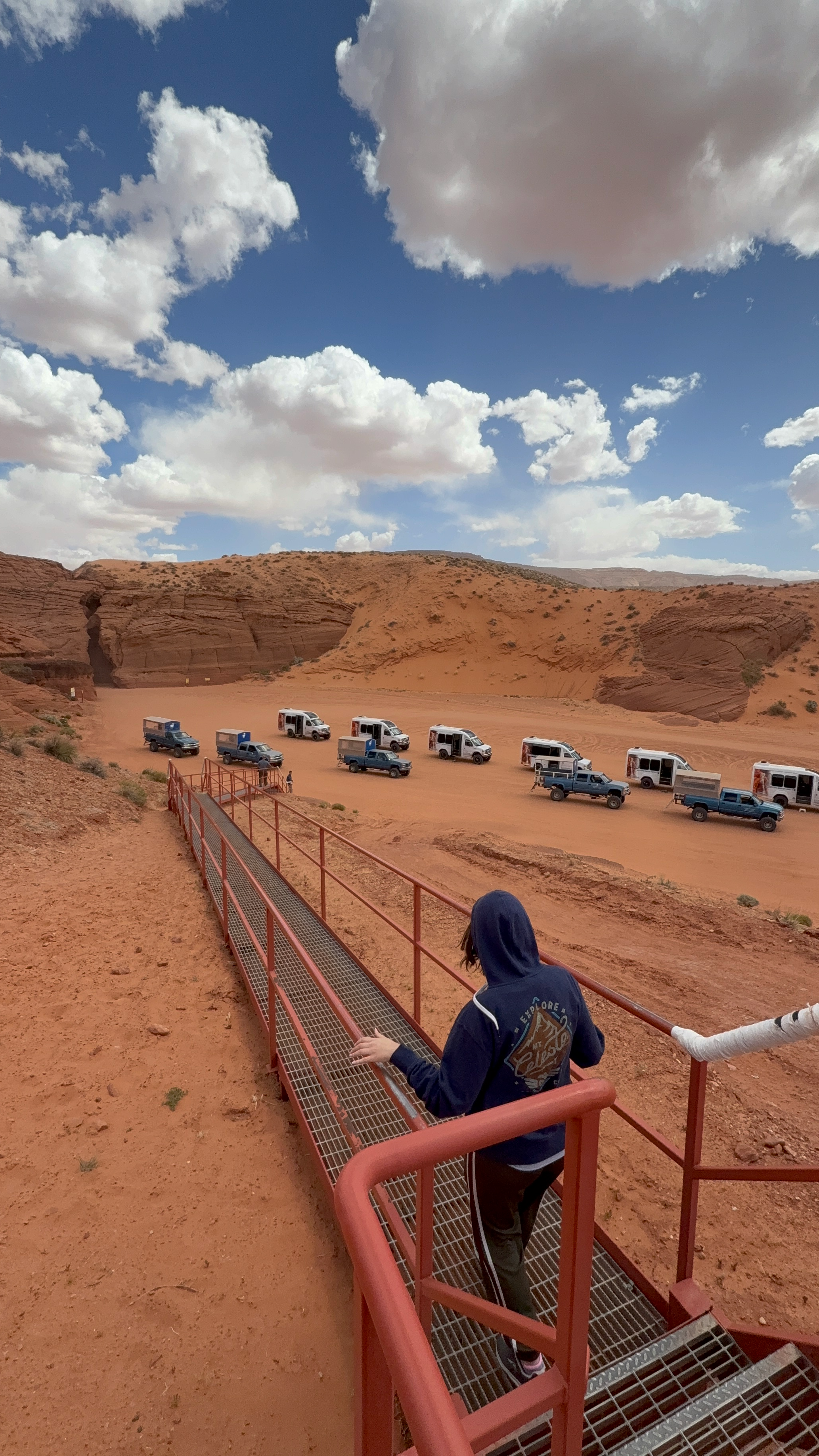Antelope Canyon is a slot canyon carved into Navajo sandstone by centuries of flash floods, and it sits on land managed by the Navajo Nation just outside Page, Arizona. You can't walk in on your own — every visit is guided, which turns out to be exactly the right call. Our guide from Navajo Tours knew where the light was hitting, which angles worked, and how to position a camera inside a narrow crack in the earth to make the result look like a Renaissance painting. We mostly tried to keep up.