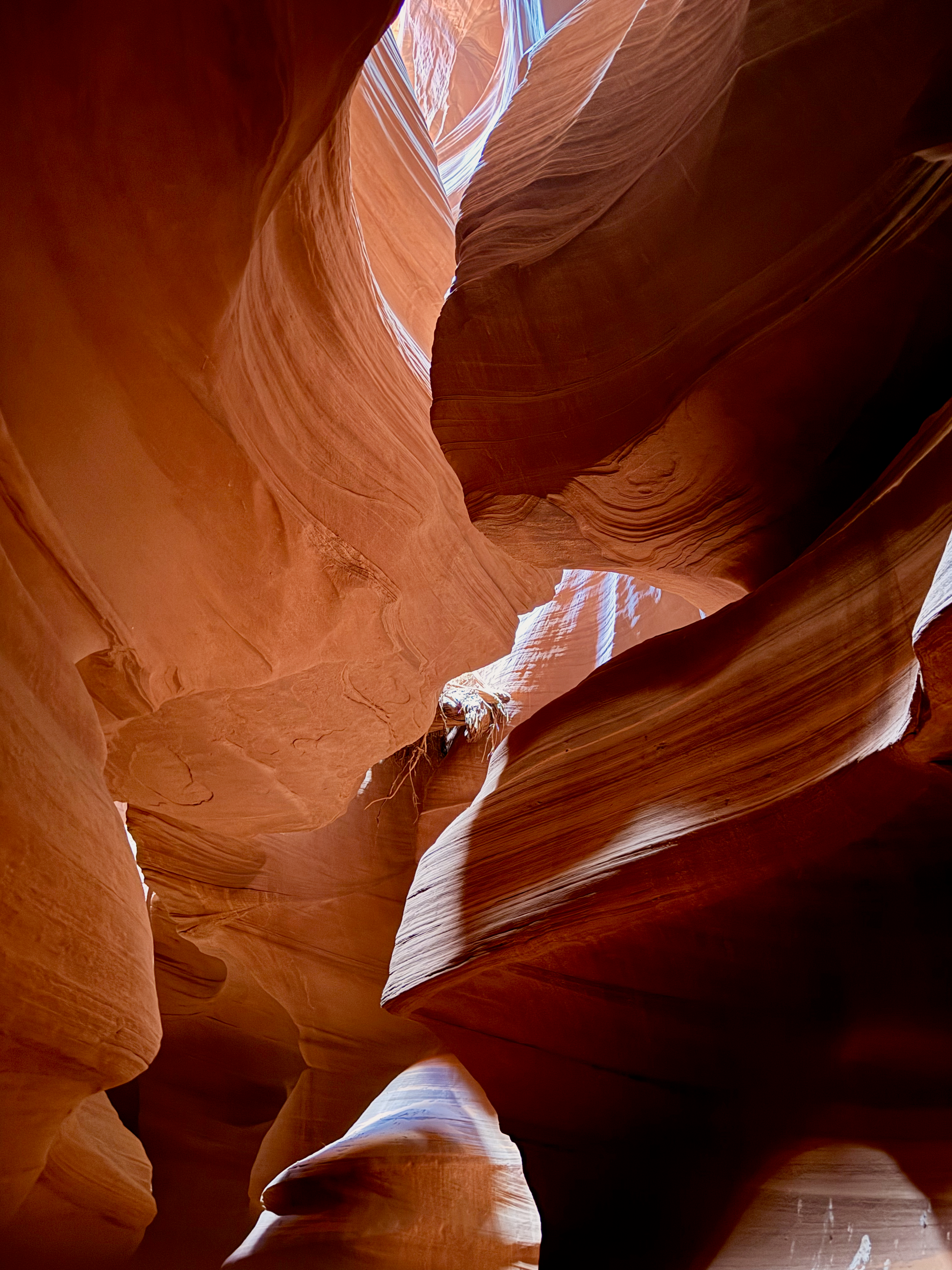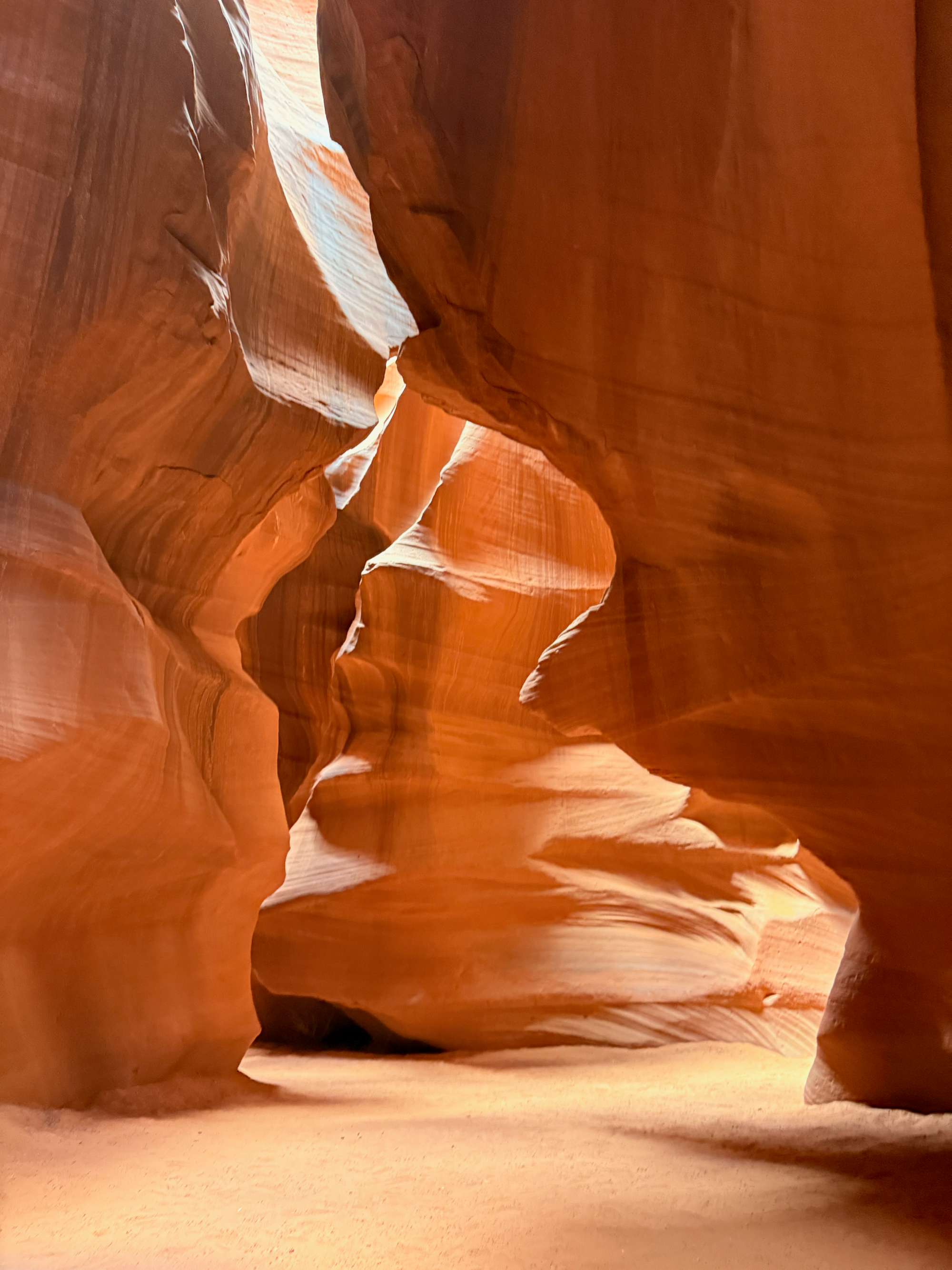 The sandstone inside Antelope Canyon does things with color that should require a filter but don't. Deep reds bleed into burnt orange, which softens into warm gold wherever a beam of light finds a gap in the rock overhead. The formations twist and curl above you in shapes that look hand-sculpted. Every ten steps is a different photograph. Every bend in the canyon is better than the last.