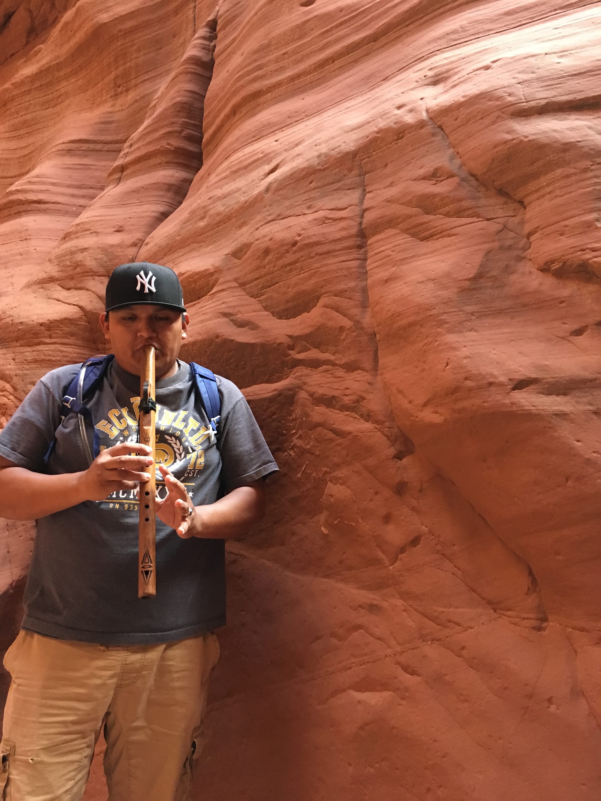 About halfway through, our guide paused in a wider section of the canyon — the main hall, where the walls open up slightly and the acoustics change — and reached into his bag. We assumed he was going to point out an interesting rock formation. He pulled out a Navajo flute.