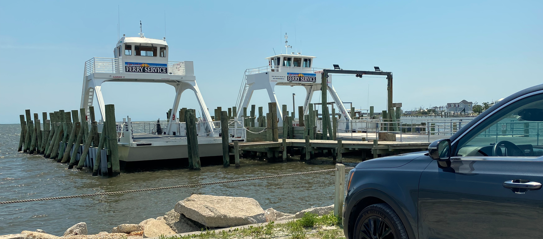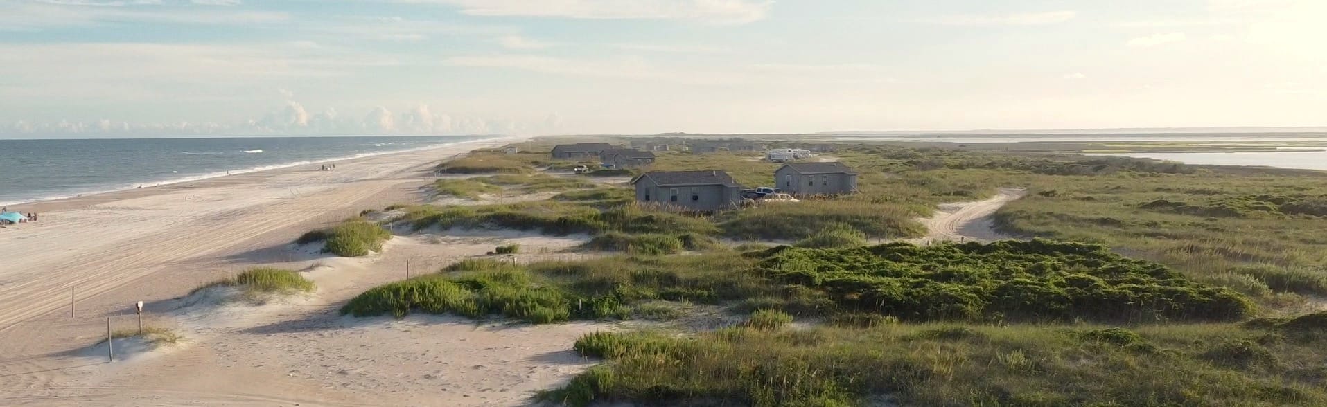 The Great Island Cabins sit on South Core Banks, accessible via vehicle ferry from Davis, NC (Cape Lookout Cabins & Ferry). The vehicle ferry is the only way to bring your car — and your car is what lets you drive the twelve miles of beach to the lighthouse and stay on the island overnight. Passenger ferry service also runs from Harkers Island if you're visiting without a vehicle, but the cabins are the vehicle-ferry experience.