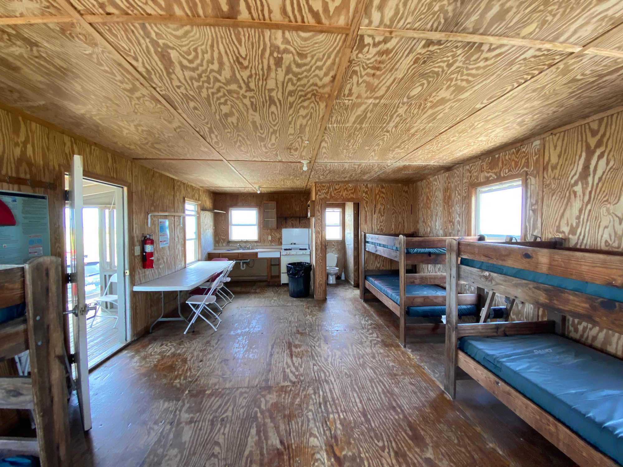 The structure is solid and well-maintained — sturdy walls, screened windows on every side, a proper door with a screen that actually closes. Eight bunk beds, simple but with mattresses that you won't resent in the morning. Bring your own linens and pillows, and within ten minutes of arriving you'll feel genuinely at home.