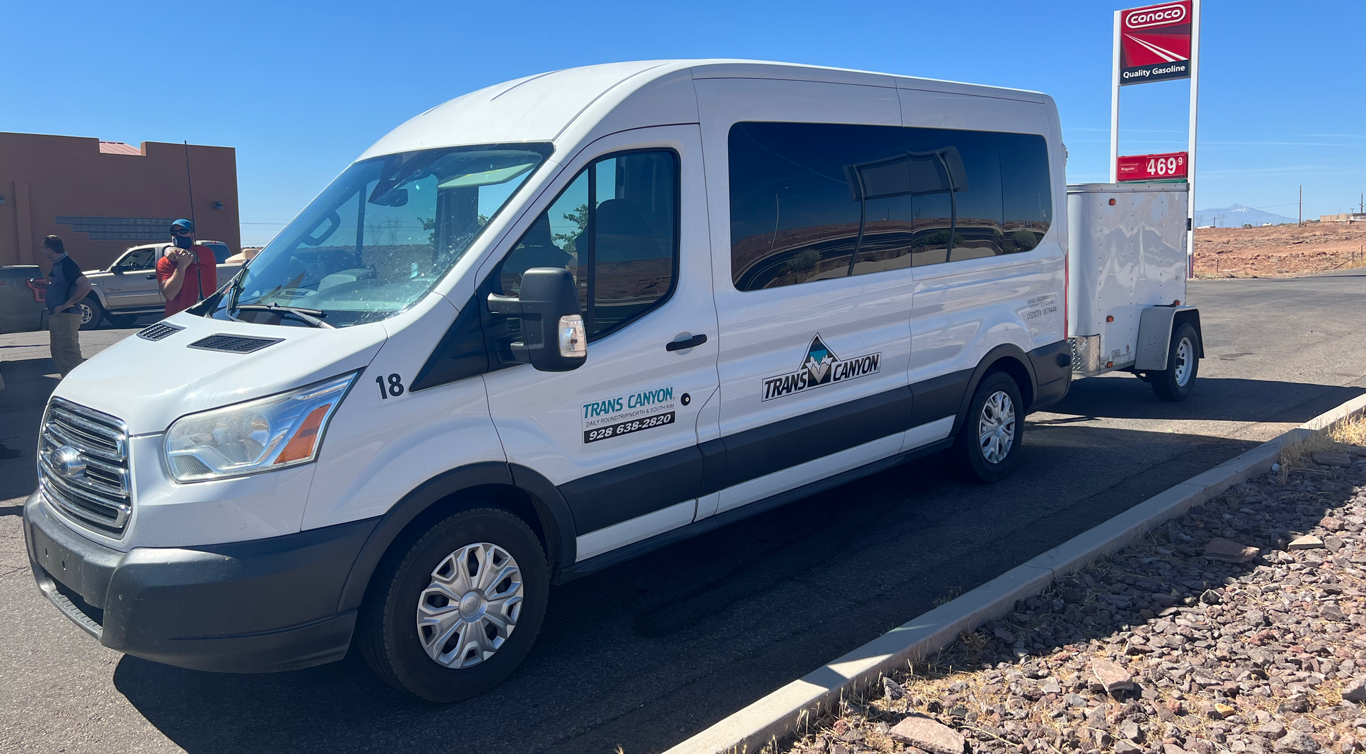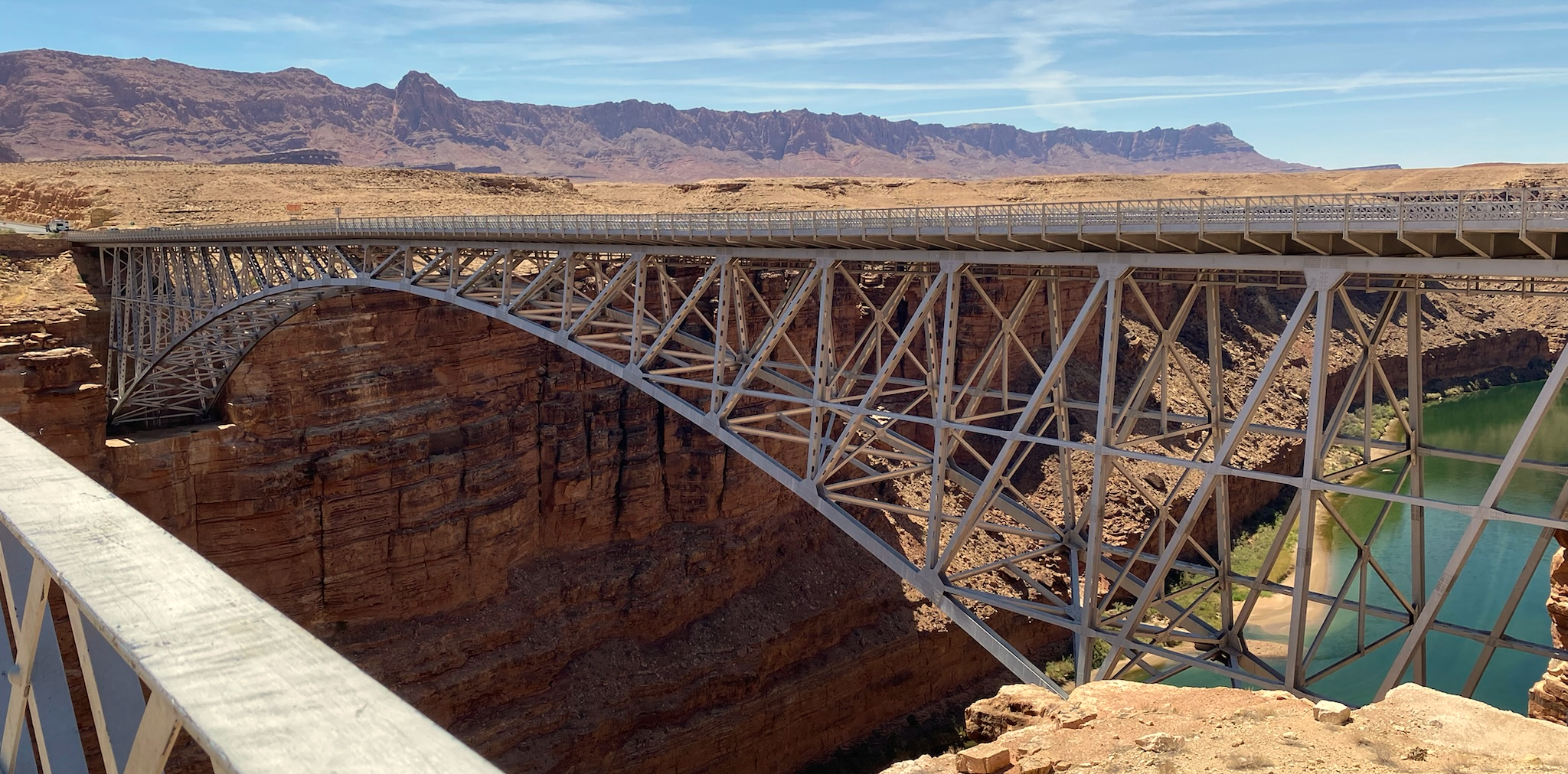 There are two rest stops along the way. The first is a gas station in Cameron, AZ — a quick stretch-your-legs kind of stop. The second is at the Navajo Bridge Interpretive Center, where you can walk out onto the historic bridge and look straight down at the Colorado River slicing through Marble Canyon far below. It's a solid preview of what's waiting inside the Grand Canyon itself.
