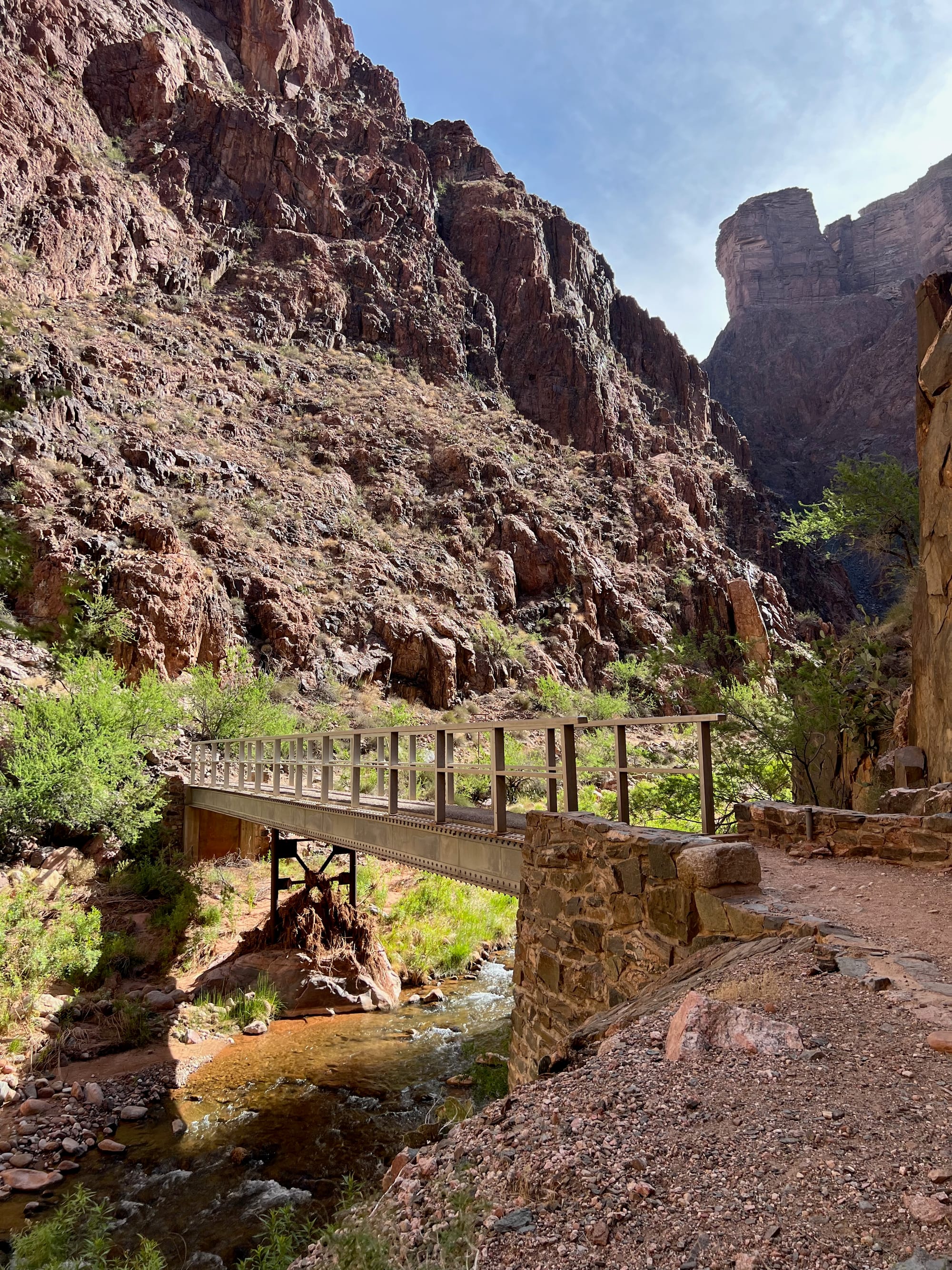 We spent time cooling our feet in Bright Angel Creek — the water was cold, clean, and exactly what our tired legs needed. Then we did a short walk to check out the two bridges that cross the Colorado River in this area: the Black Bridge (also called the Kaibab Suspension Bridge) and the Silver Bridge (the Bright Angel Trail bridge that we'd be crossing the next morning).