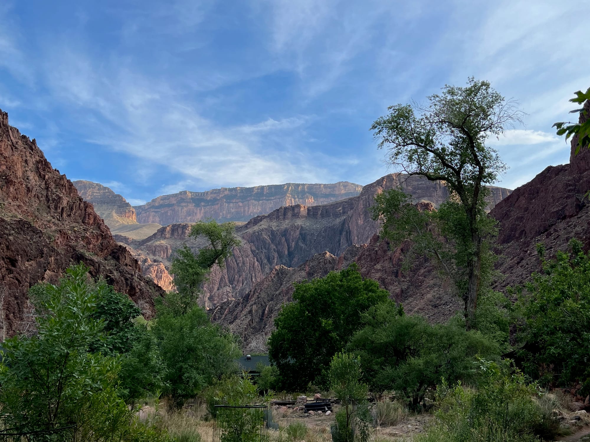 By early afternoon, the trail opened up and we reached the canyon floor. The landscape here is different from anything above — flat, dry, and desert-like, with the Colorado River visible in the distance and Phantom Ranch tucked among a grove of cottonwood trees.