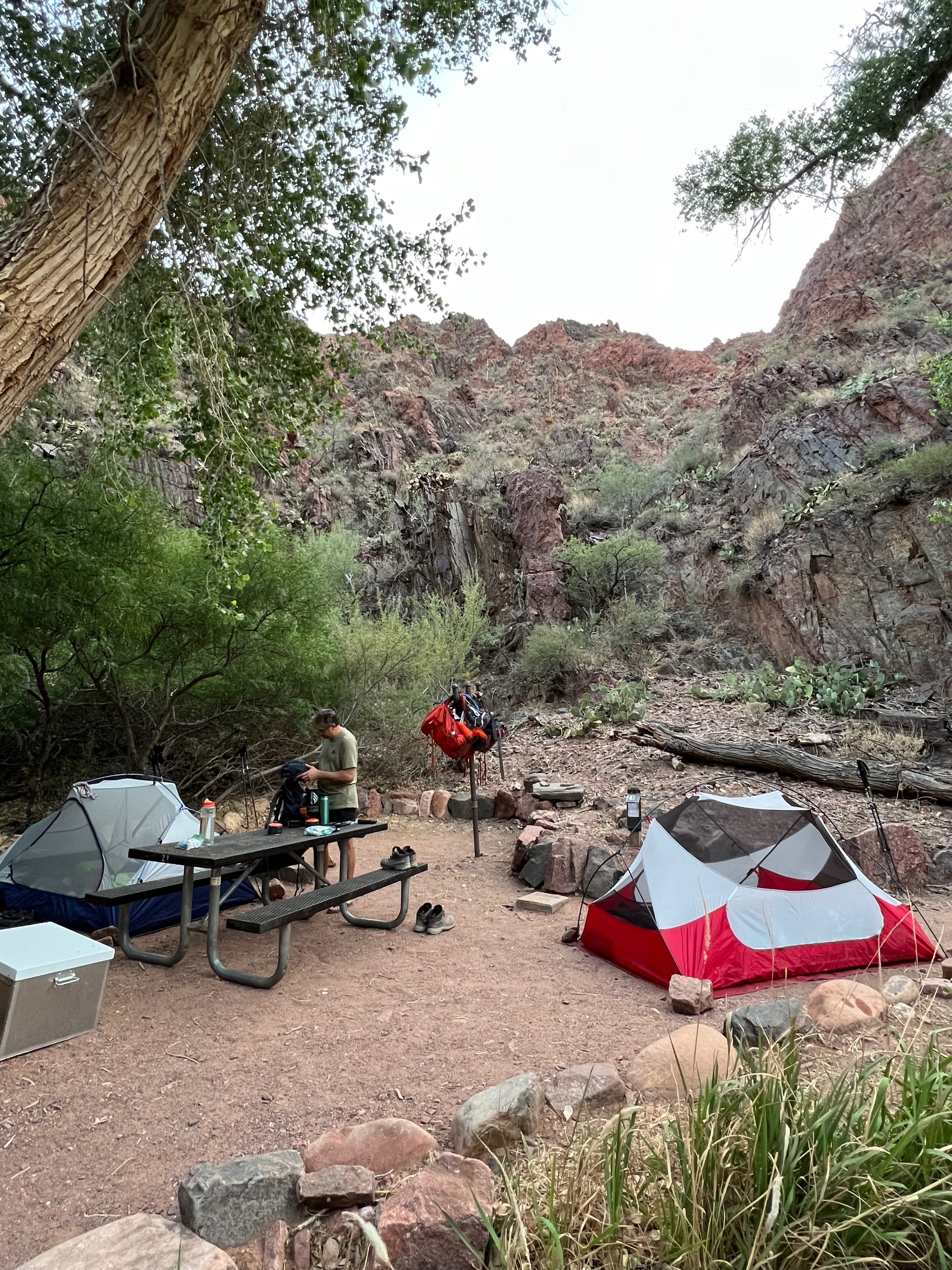 We checked into Bright Angel Campground, which sits near Phantom Ranch along Bright Angel Creek. The campground has basic amenities — pit toilets, a water spigot, and flat tent sites — but after a morning in The Box, it felt like a resort.